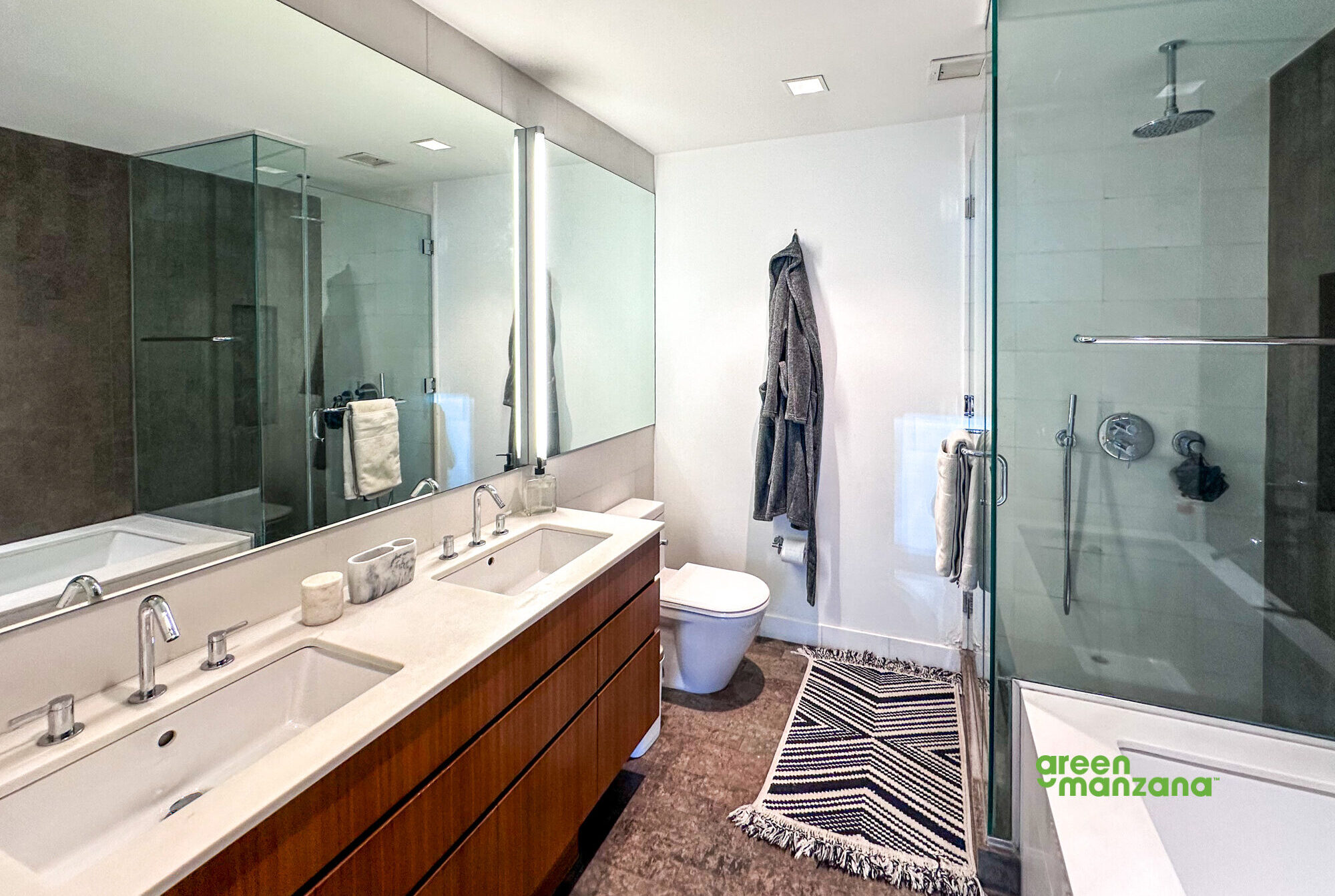 The south facing windows didn’t rush the day. Instead, they let the light build slowly. By late morning the apartment began to glow. The white quartzite counters caught it first. Then the steel. Then her cheekbones as she leaned into the kitchen to slice fruit.